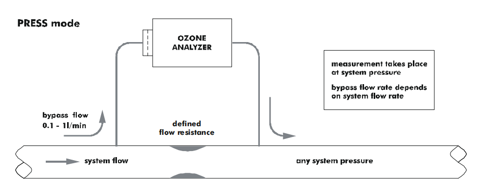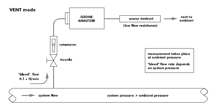 當(dāng)系統(tǒng)低流速較高時(shí),例如在每分鐘 1 到 10 升之間, 很好的解決方案是將臭氧分析儀旁路連接到臭氧管路中的小流阻。在這個(gè)流動(dòng)阻力下的壓降應(yīng)該在幾毫巴的數(shù)量級(jí),以允許足夠的樣氣流過(guò)分析儀。